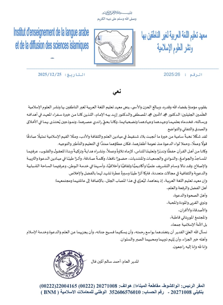 نعى معهد تعليم اللغة العربية لغير الناطقين بها ونشر العلوم الإسلامية اليوم الخميس ٢٥ /١٢/٢٠٢٥ الدكتور محمد الأمين محمد المصطفى و الدكتور إيزيد بيه الإمام .